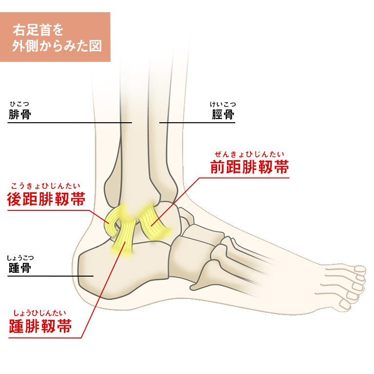 足関節捻挫の多くは、足首を内側に捻った際に外力が加わり、足関節を安定化させている靭帯に過度の緊張が加わって損傷することで起こります。これを足関節内反捻挫といいます。特に、外くるぶし尖端の前方に位置する前距腓靭帯に損傷が起こることが多いとされています。