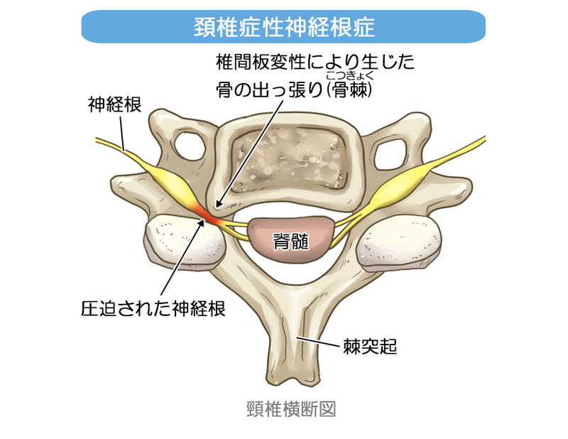 加齢変化による頚椎症(椎間板の膨隆・骨のとげの形成)の変化によって、脊髄から分かれて上肢へゆく「神経根」が圧迫されたり刺激されたりして起こります。