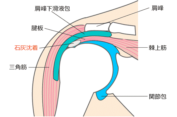 石灰が、どんどん溜まって膨らんでくると痛みが増してきます。そして、腱板から滑液包内に破れ出る時に激痛となります。