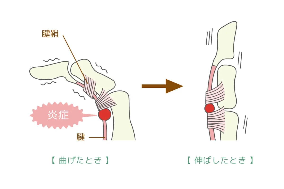 指の使いすぎによる負荷のため、動かすたびに摩擦のため炎症が進み、腱鞘が肥厚したり、腱が肥大し、通過障害を起こすために一層症状が悪化します。