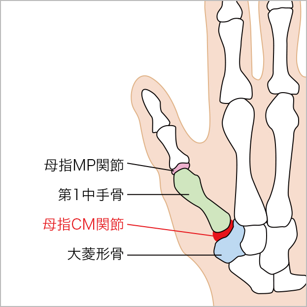 母指の手前の甲の骨(第1中手骨)と、手首の小さい骨(大菱形骨)の間の関節(第1手根中手骨関節:CM関節)は、母指が他の指と向き合ってつまみ動作ができるよう大きな動きのある関節です。