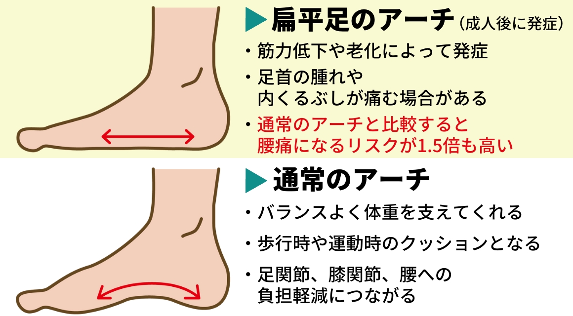 中年以降に発症する扁平足では、内側のくるぶしの下が腫れ痛みが生じます。