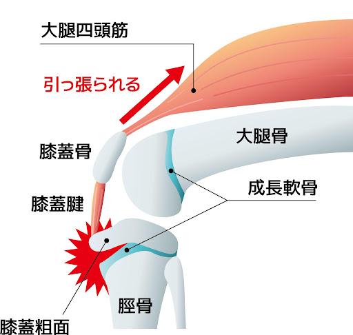 その状態では、筋肉に強度と柔軟性がないので、スポーツなどの運動を過度に行なうと、大腿四頭筋からつながる脛骨粗面部に負荷がかかり、軟骨が一部はがれるなどの物理的な刺激が生じます。