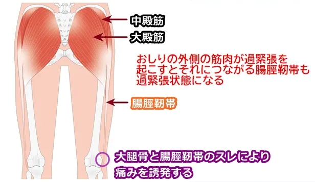 膝の繰り返しの曲げ伸ばし、特にランニングなどで腸脛靭帯がピンと張った状態になる大腿骨外側上顆という部分で強く擦れます。