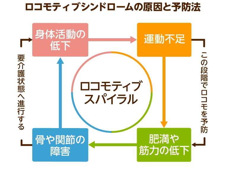 ロコモティブシンドロームの原因は、加齢による筋力の低下や、骨や関節といった運動器の病気などです。