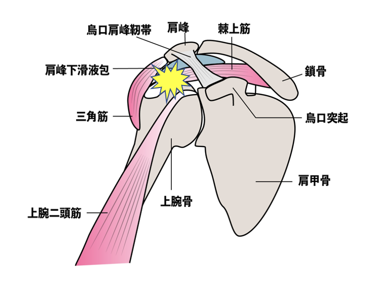 上腕を外転する課程で、上腕骨と肩峰の間に腱板の一部や肩峰下滑液包などが挟み込まれ、繰り返して刺激が加わると滑液包に浮腫や出血が起こります。